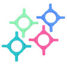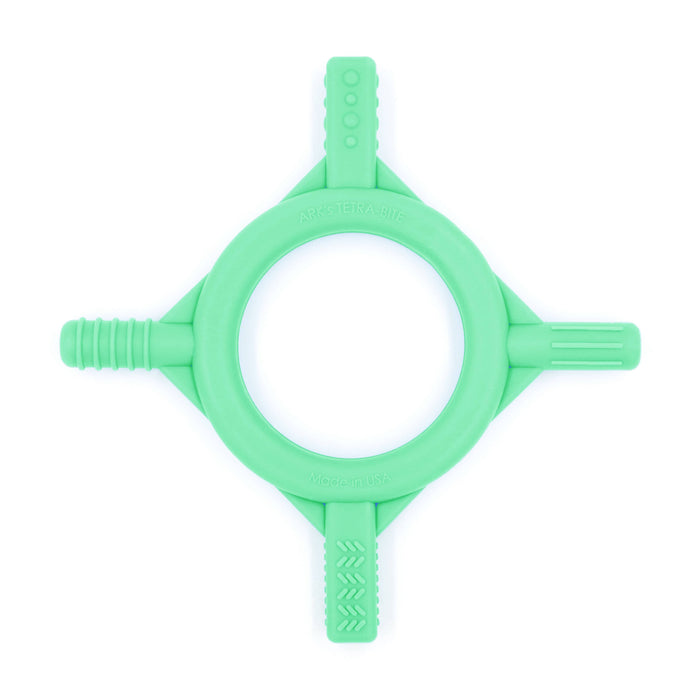 The blue, teal, and pink Baby Tetra-Bites are soft and chewy. The turquoise Baby Tetra-Bite is firmer yet still chewy and pliable. Teething babies may prefer the firmer option, as it provides added resistance and input to the gums.