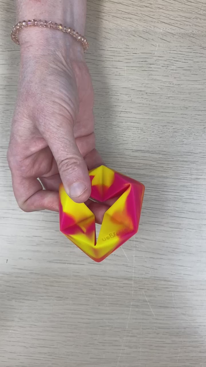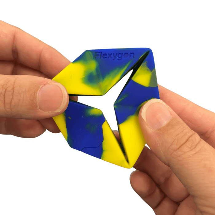 Flexygon - a colourful endlessly flexible hexaflexagon-shaped fidget toy - is Trainers Warehouse latest exclusive finger fidget toy. We designed Flexygon to fit in the palm of your hand and to roll endlessly through your fingertips. With a hole in the middle and creases at each section of the firm silicon hexaflexagon, you can endlessly roll Flexygon inside and out. The colorful swirl pattern adds to the mesmerizing look of the fidget.