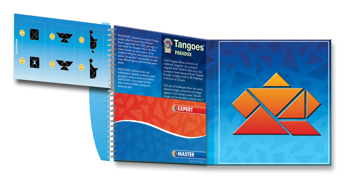 Each pair of challenges shows two nearly identical images, except that one image appears to be missing a piece, Yet both images can be recreated using the same 7 tangram puzzle pieces. How is this possible? Can you solve this paradox? Ages 10+