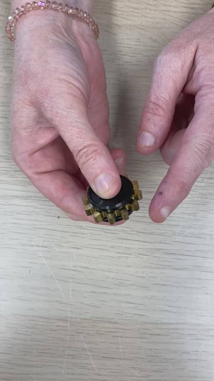 The Mega Cog is the same size as a 50c coin. Its' 40 grams makes it beautifully weighted as well and a great size for adult or big hands! This has a super fast spin, soft vibration & slight hum which is amazing. Rolling the cog over hands and fingers gives great sensory input. Some like the way it "tickles" when spinning.