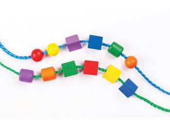 The set includes 72 durable wooden beads in six bright colours and four distinct shapes, plus 12 double-sided pattern cards featuring vibrant full-colour and black-and-white patterns for added challenge. Children can copy these patterns by threading the beads onto 4 included laces, helping to reinforce counting and coordination through play.